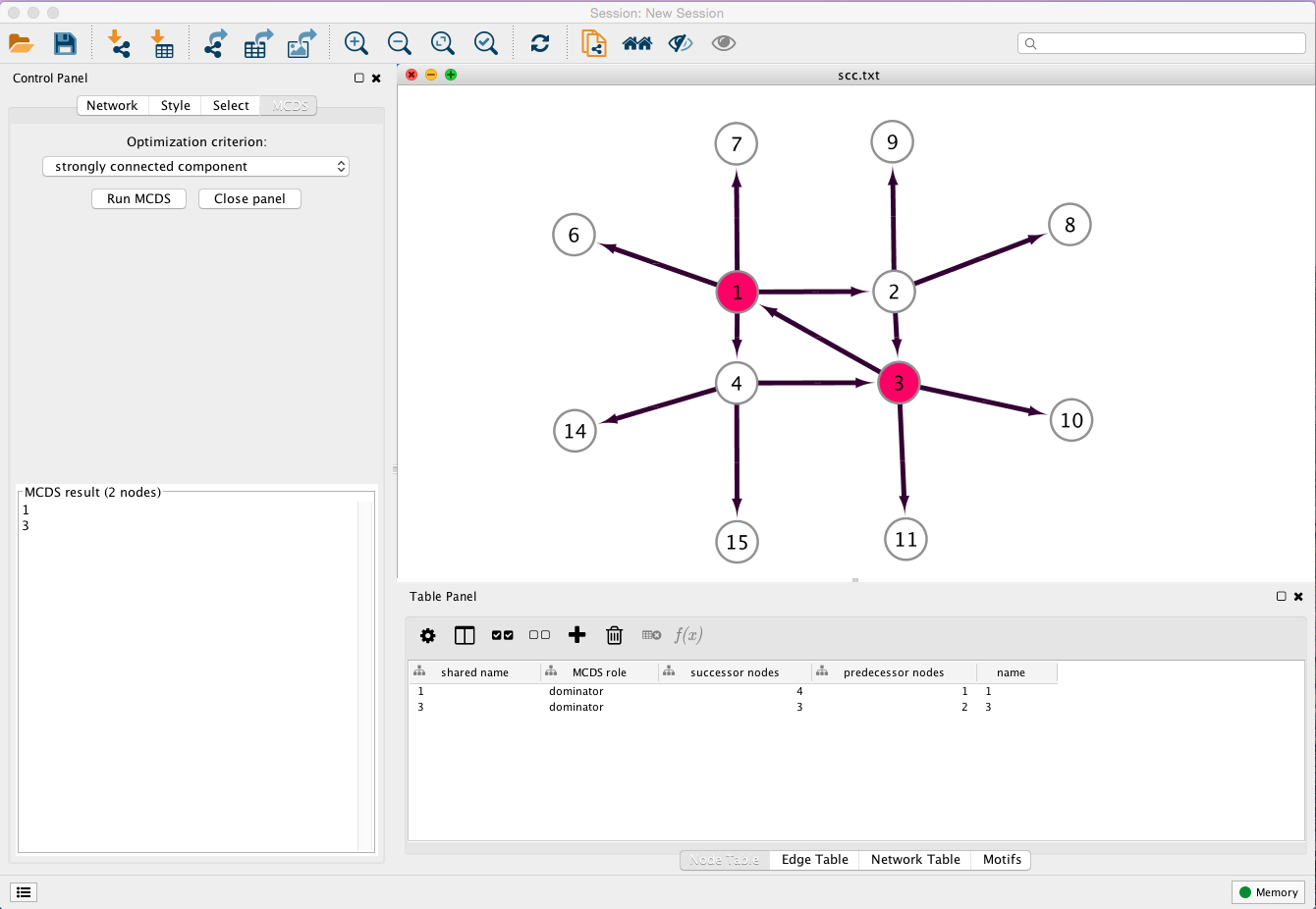 MCDS is a Cytoscape app that allows users to find an approximate MCDS solution in a directed graph. The user can choose to run the algorithm on the largest connected component underlying directed graph (LCCD) and undirected graph (LCC), as well as the strongly connected component (SCC) of the network. The connectivity among the nodes in the MCDS can then be visualized via Cytoscape.